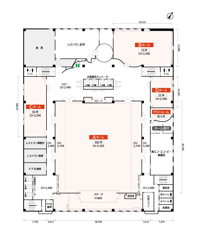 | 各設備のサイズ | お客様用エレベーター (4機) | 荷物専用エレベーター (3機) | 大型リフト (1機) | ||